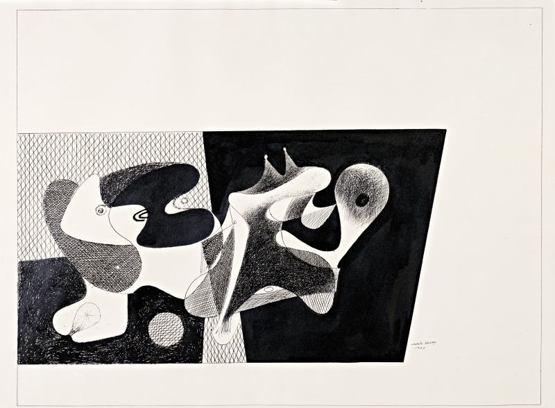 In 1929, Gorky began a series of abstract works which is now referred to as "Nighttime, Enigma, and Nostalgia." While he continued working on this until 1936, it was between 1931 and 1934 that he was most dedicated to developing the composition. Ultimately, he produced nearly one hundred drawings and three related paintings. The body of work can be divided into subsets, such as the posthumously titled "Fish and Head," "Écorché" and "Column with Objects." Two subsets, Enigma and Objects, are Gorky's own titles. He gave the latter title to this drawing when it was acquired by the Museum of Modern Art in January 1941.