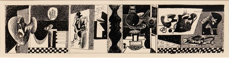 The imagery for the 1934 mural design is derived primarily from Gorky's "Nighttime, Enigma, and Nostalgia" series. In combining the various elements from the series, Gorky borrowed the compositional structure of Paolo Uccello's six-part tempera panel, Miracle of the Desecrated Host (1467–1468), black-and-white reproductions of which were pinned to his studio wall.